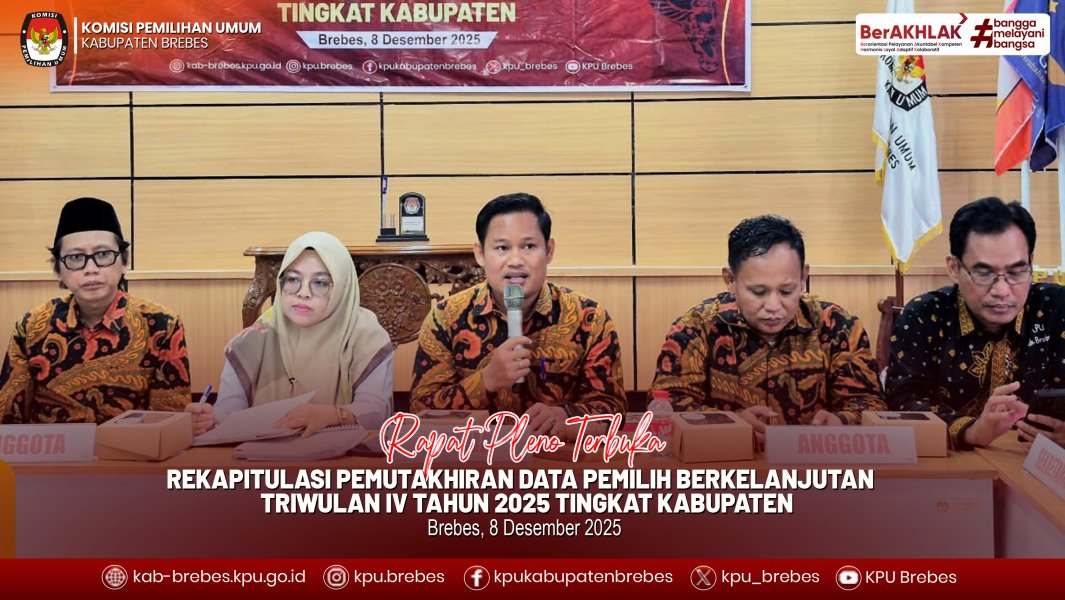 #Temanpemilih KPU Kabupaten Brebes melaksanakan kegiatan Rapat Pleno Terbuka Rekapitulasi Pemutakhiran Data Pemilih Berkelanjutan (PDPB) Tingkat Kabupaten Triwulan IV Tahun 2025, berlangsung di Ruang Rapat Kantor KPU Kabupaten Brebes, Senin (8/12).