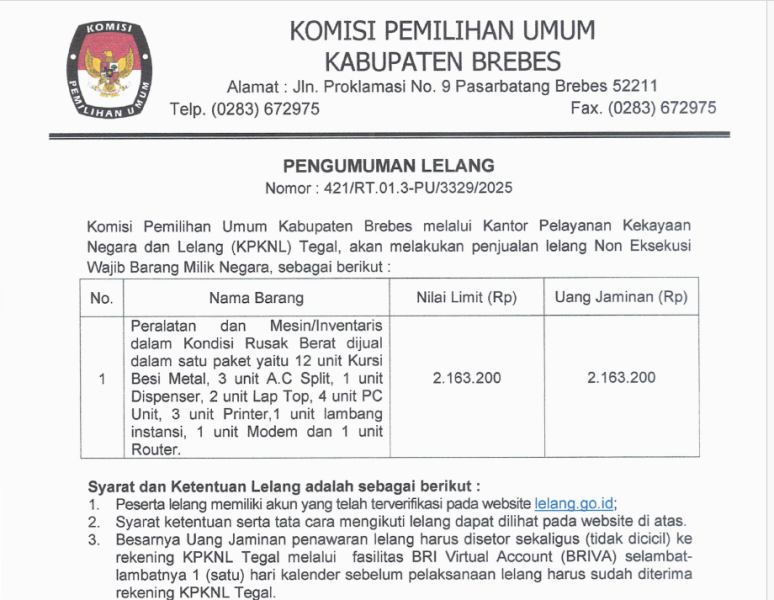 PENGUMUMAN LELANG NON EKSEKUSI WAJIB BARANG MILIK NEGARA Selasa, 09 Desember 2025 10:00 4 Unduh disini Bagikan: Telah dilihat 4 kali