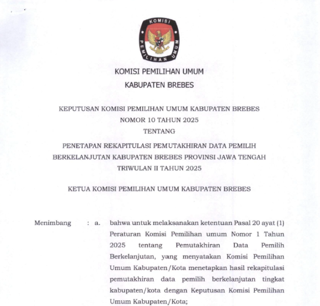 KEPUTUSAN KPU KABUPATEN BREBES NOMOR 10 TAHUN 2025 TENTANG PENETAPAN REKAPITULASI PEMUTAKHIRAN DATA PEMILIH BERKELANJUTAN TRIWULAN II TAHUN 2025