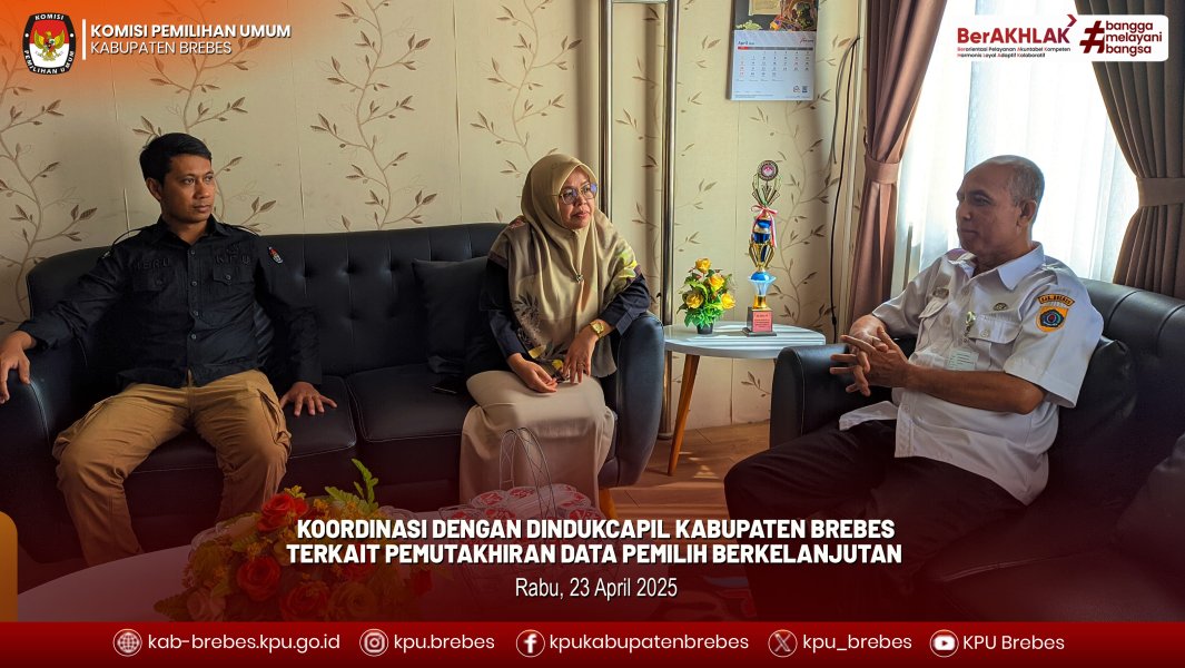 #Temanpemilih KPU Kabupaten Brebes berkoordinasi dengan Dindukcapil Kabupaten Brebes terkait Pemutakhiran Data Pemilih Berkelanjutan (PDPB) di Kantor Dindukcapil Kabupaten Brebes, 23 April 2025.