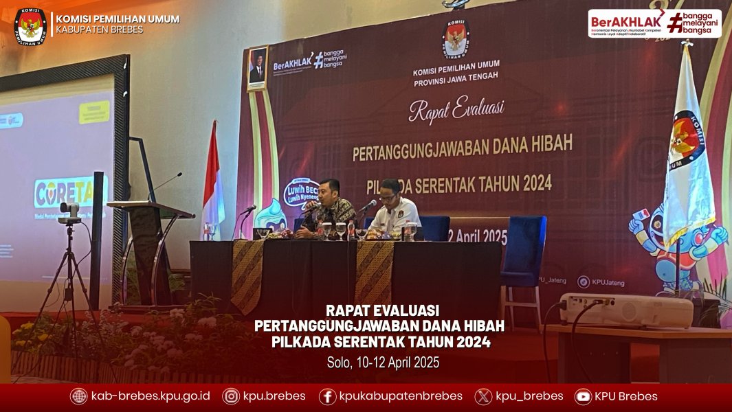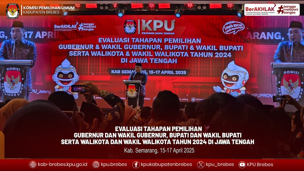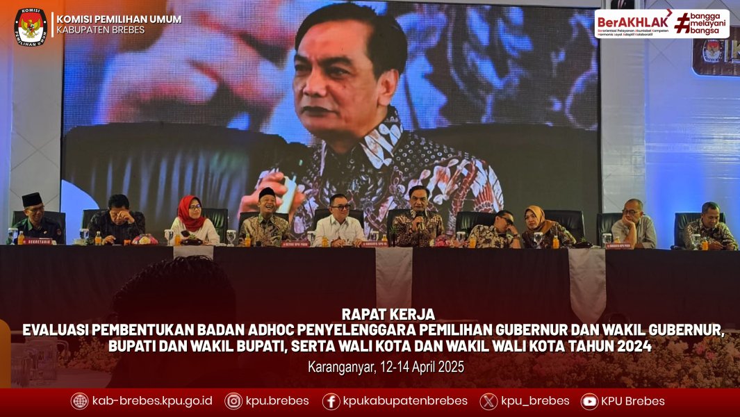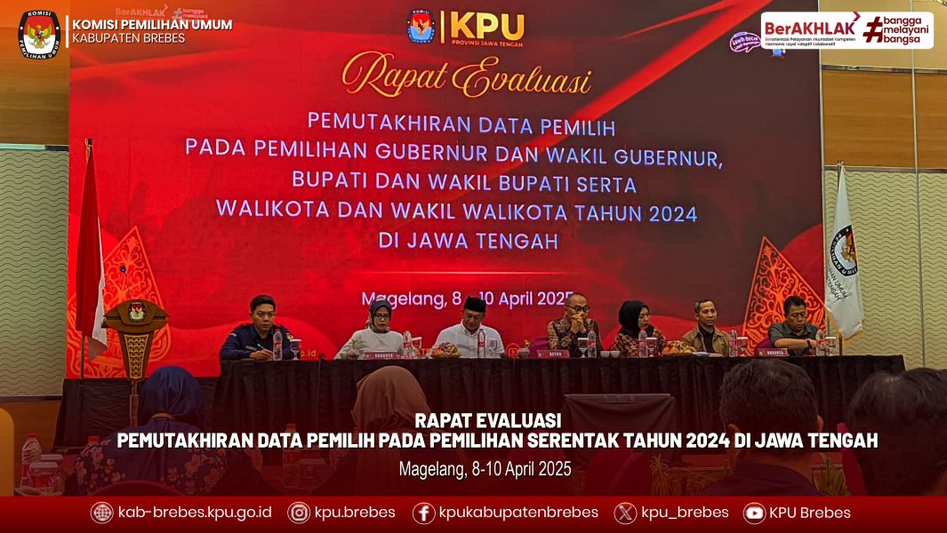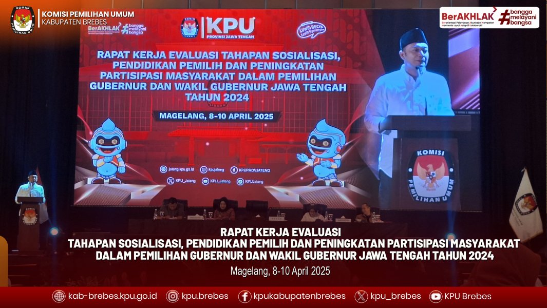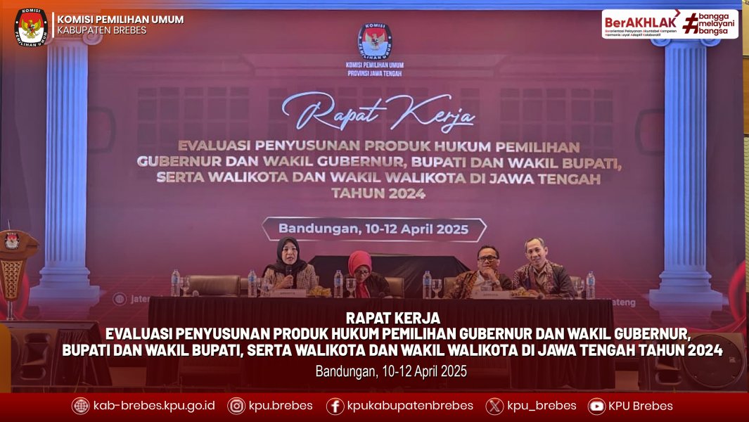 #Temanpemilih KPU Kabupaten Brebes mengikuti Kegiatan Rapat Kerja Evaluasi Penyusunan Produk Hukum Pemilihan Gubernur dan Wakil Gubernur, Bupati dan Wakil Bupati, serta Wali Kota dan Wakil Wali Kota Tahun 2024. Kegiatan ini dilaksanakan pada 10 hingga 12 April 2025 di Hotel Griya Persada, Bandungan, Kabupaten Semarang.