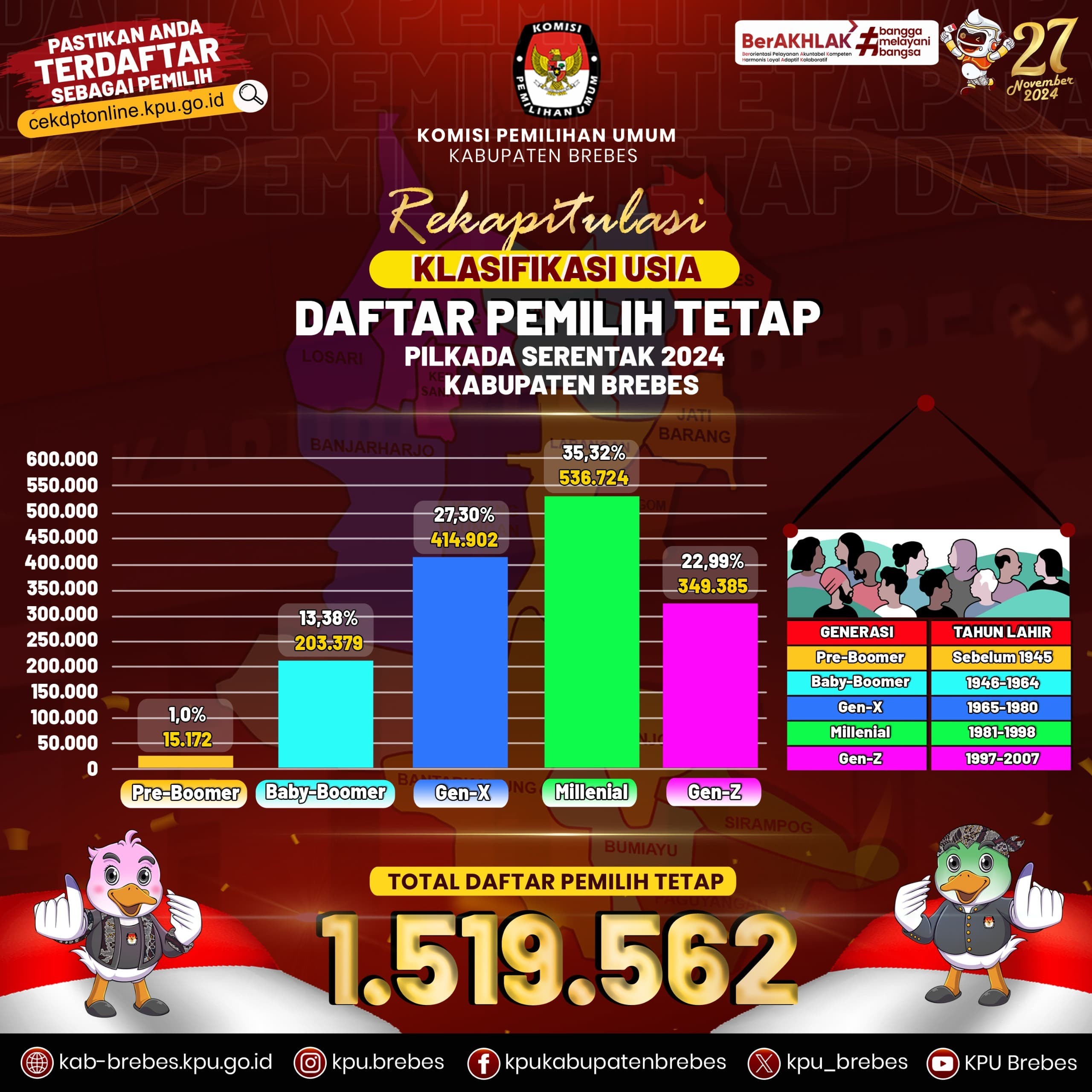 KLASIFIKASI USIA DAFTAR PEMILIH TETAP PILKADA 2024 KABUPATEN BREBES Jumat, 20 September 2024 16:00 73 Baca Selengkapnya