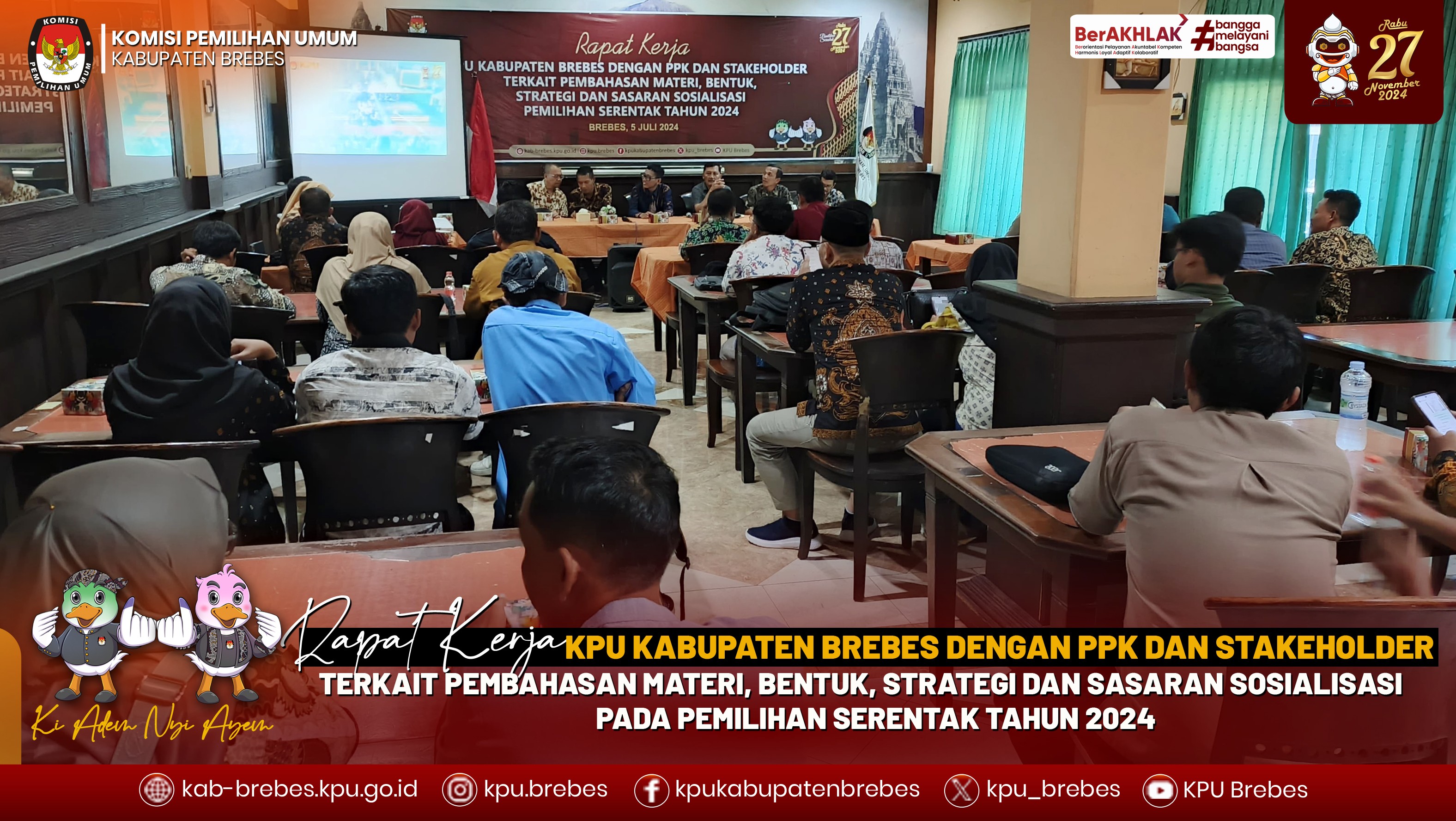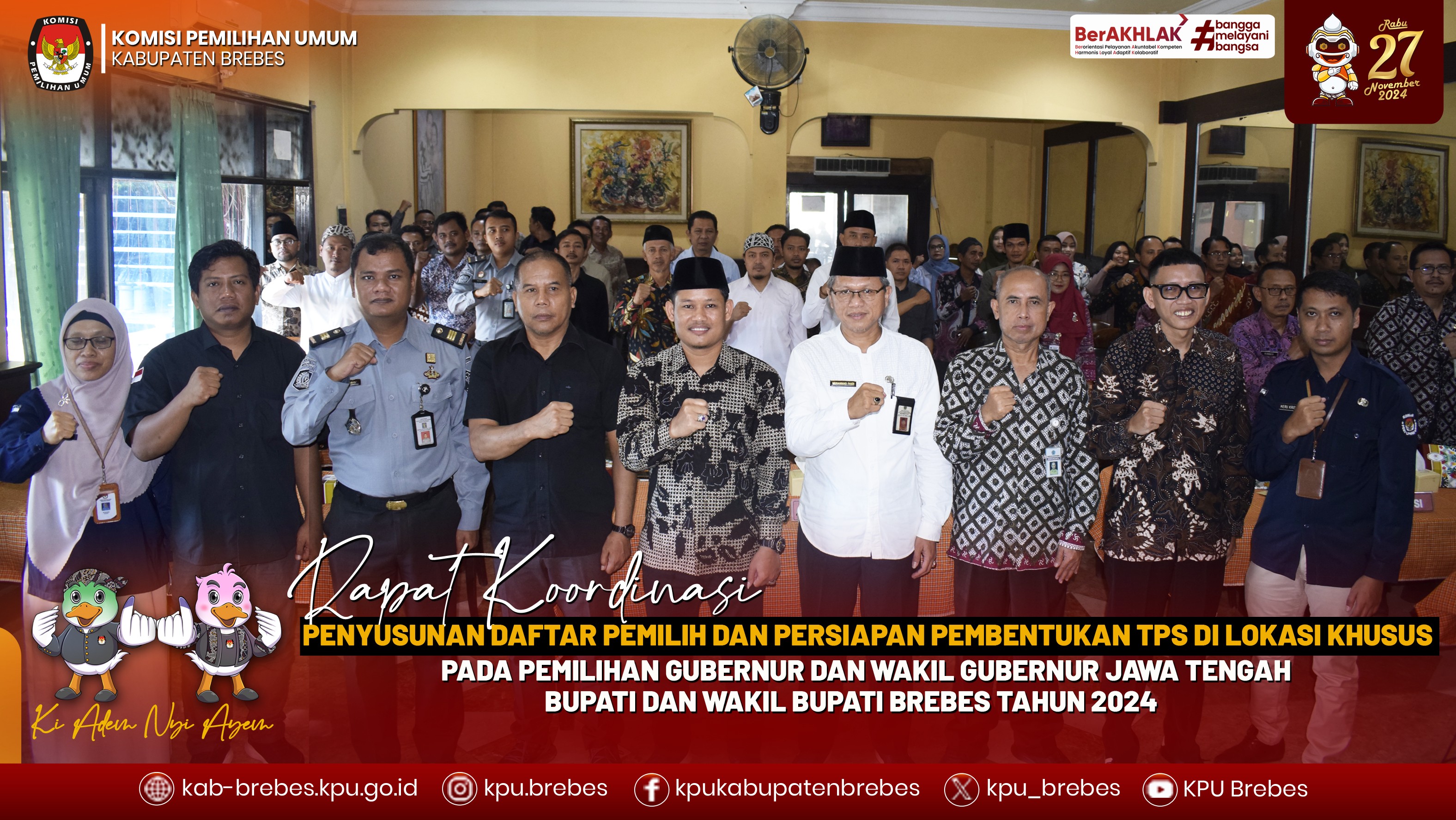 #Temanpemilih KPU Kabupaten Brebes melaksanakan Kegiatan Rapat Koordinasi Penyusunan Daftar Pemilih dan Pembentukan TPS di Lokasi Khusus pada Pemilihan Gubernur dan Wakil Gubernur, Bupati dan Wakil Bupati pada tahun 2024 di RM. Mbok Berek, Kegiatan ini dihadiri oleh Ketua PPK, PPK Divisi Datin, Polres Brebes, Dindukcapil Kab. Brebes, Dinsos Kab. brebes, Bakesbangpol Kab. Brebes, BPBD Kab. Brebes, Lapas IIb Brebes, Kemenag Kab. Brebes, Bawaslu Brebes, Panti Werda Yuwono dan Ponpes yang ada di Kabupaten Brebes, Selasa (9/7).