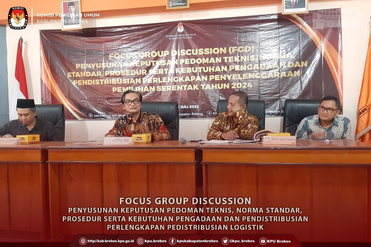 Minggu (3/7), Ketua KPU Kab. Brebes Muamar Riza Pahlevi bersama Anggota KPU Kab. Brebes Divisi Hukum dan Pengawasan Akhmad Nizam Baequni dan Kasubbag. Hukum dan Pengawasan Iman Syah Budiono serta Staf Riza Anggara, mengikuti Forum Group Discussion (FGD) Persiapan Penyusunan Keputusan Pedoman Teknis, Norma, Standar, Prosedur serta Kebutuhan Pengadaan dan Pendistribusian Perlengkapan Penyelenggaraan Pemilihan Serentak Tahun 2024 yang digelar oleh KPU Kab. Batang.