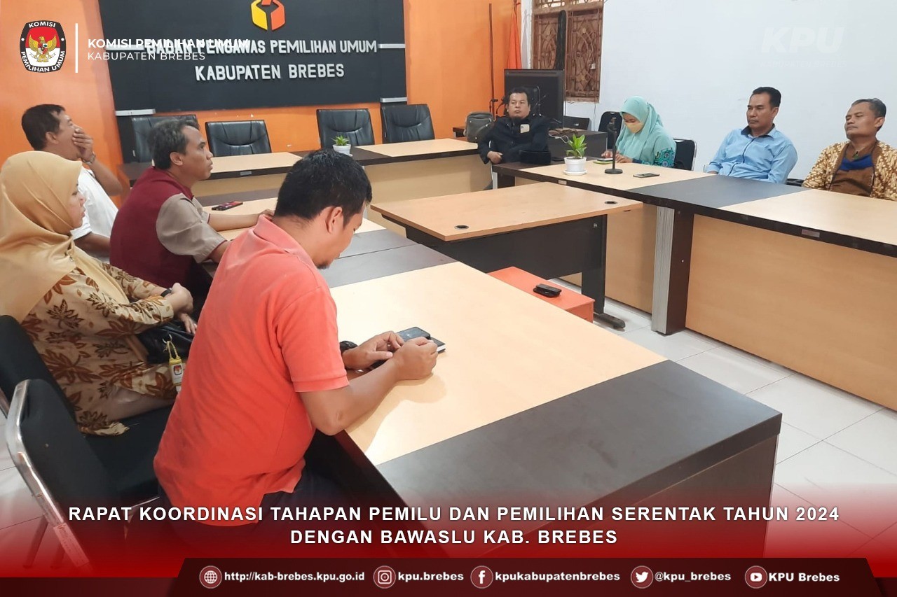Brebes - Jumat (10/6), Jajaran Komisioner KPU Kab. Brebes lakukan koordinasi dengan Bawaslu Kab. Brebes dalam rangka membangun sinergi jelang Tahapan Pemilu dan Pemilihan Tahun 2024.