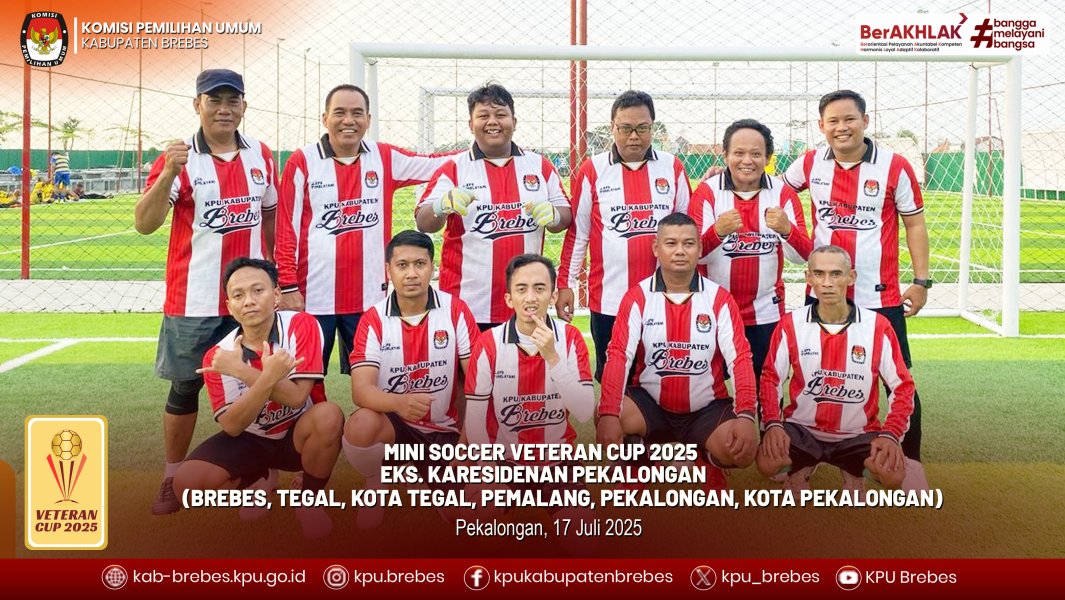 #Temanpemilih KPU Kabupaten Brebes mengikuti Kegiatan Mini Soccer Veteran Cup 2025 eks Karesidenan Pekalongan, Kegiatan ini telah dilaksanakan pada tanggal 17 Juli 2025 di Lapangan Mini Soccer “Titik Temu” Karangdowo, Kec. Kedungwuni, Kab. Pekalongan yang diikuti oleh 6 KPU Kabupaten/ Kota yaitu Brebes, Kota Tegal, Kabupaten Tegal, Pemalang, Kota Pekalongan dan Kabupaten Pekalongan, sementara Kabupaten Batang ikut di grup Eks Karesidan Semarang.
