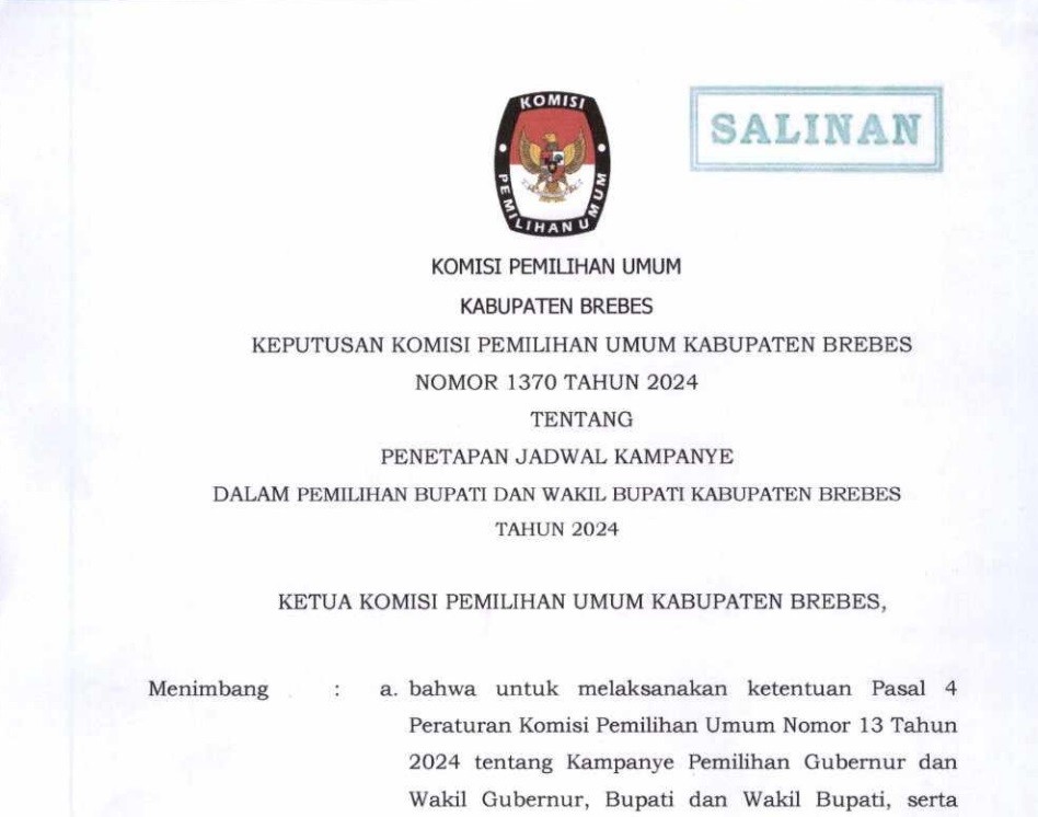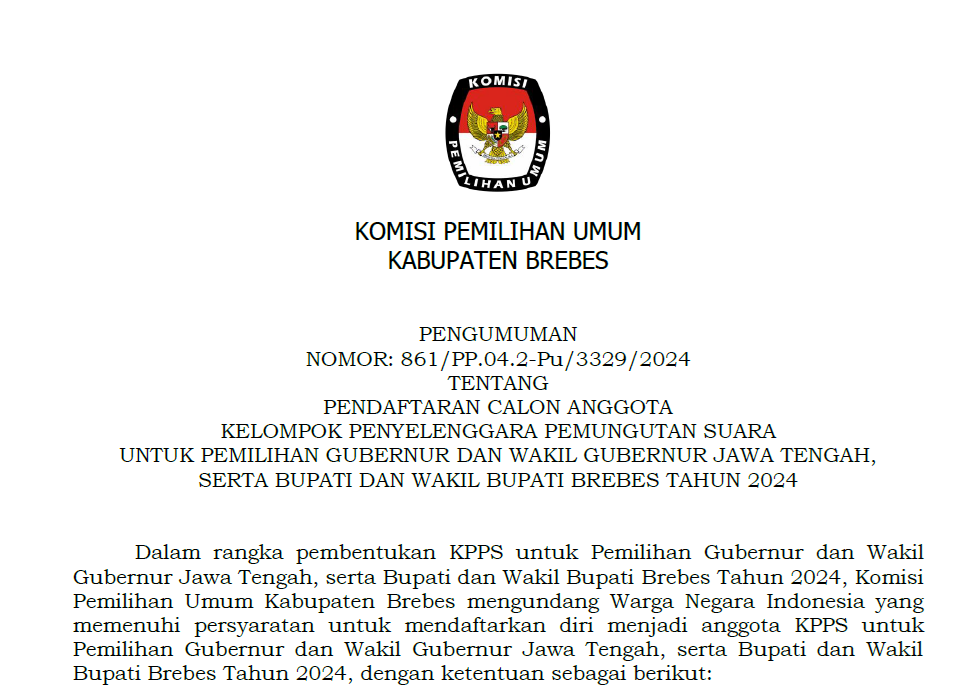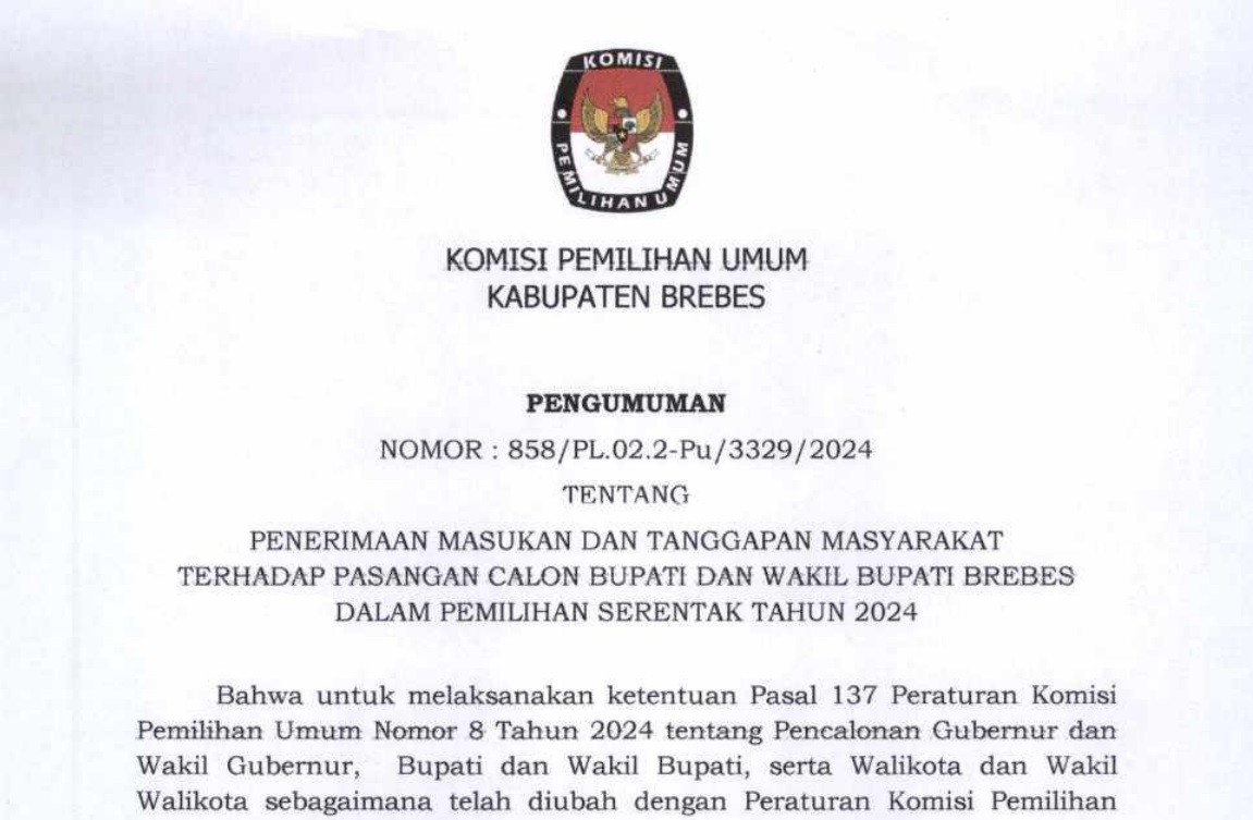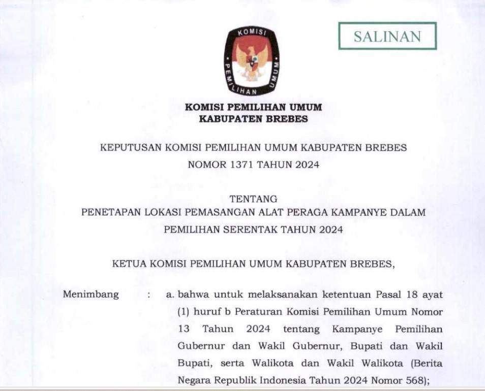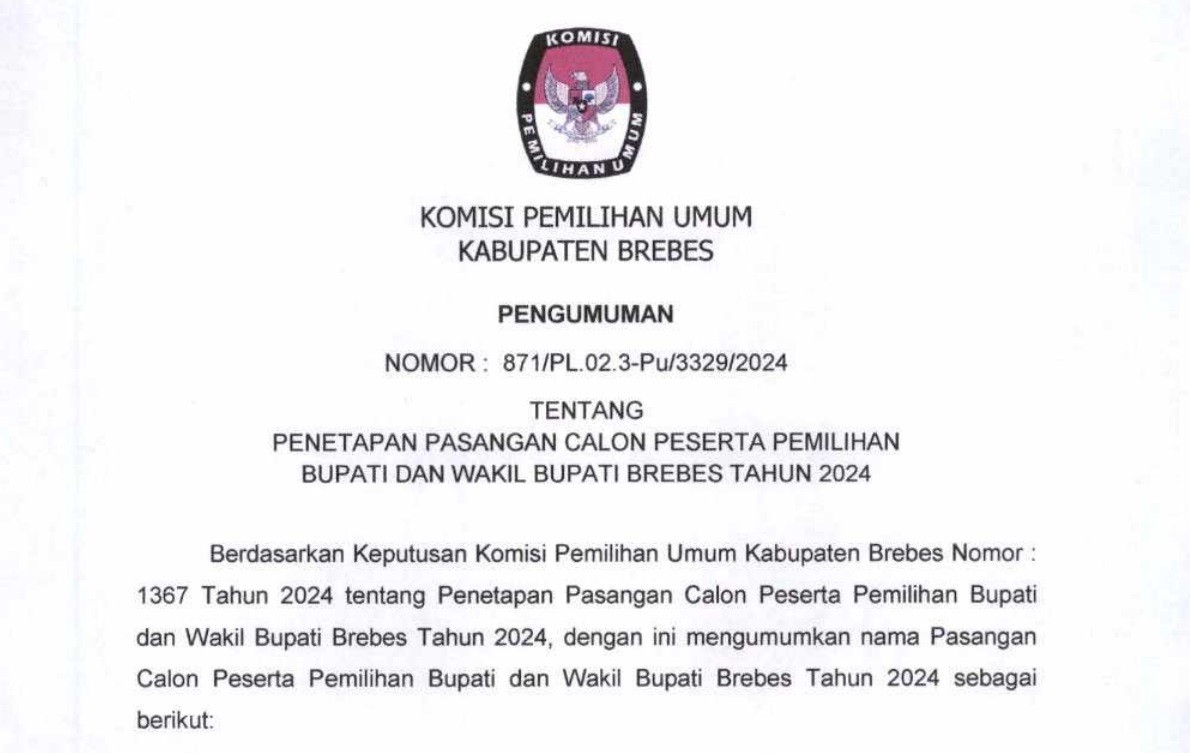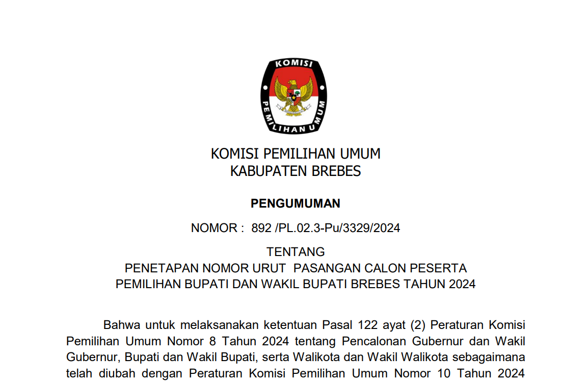 Bahwa untuk melaksanakan ketentuan Pasal 122 ayat (2) Peraturan Komisi Pemilihan Umum Nomor 8 Tahun 2024 tentang Pencalonan Gubernur dan Wakil Gubernur, Bupati dan Wakil Bupati, serta Walikota dan Wakil Walikota sebagaimana telah diubah dengan Peraturan Komisi Pemilihan Umum Nomor 10 Tahun 2024 tentang Perubahan atas Peraturan Komisi Pemilihan Umum Nomor 8 Tahun 2024 tentang Pencalonan Gubernur dan Wakil Gubernur, Bupati dan Wakil Bupati, serta Walikota dan Wakil Walikota, Komisi Pemilihan Umum Kabupaten Brebes telah melakukan pengundian nomor urut Pasangan Calon Bupati dan Wakil Bupati Brebes berdasarkan Pasal 121 Peraturan Komisi Pemilihan Umum Nomor 8 Tahun 2024 tentang Pencalonan Gubernur dan Wakil Gubernur, Bupati dan Wakil Bupati, serta Walikota dan Wakil Walikota sebagaimana telah diubah dengan Peraturan Komisi Pemilihan Umum Nomor 10 Tahun 2024 tentang Perubahan Atas Peraturan Komisi Pemilihan Umum Nomor 8 Tahun 2024 tentang Pencalonan Gubernur dan Wakil Gubernur, Bupati dan Wakil Bupati, serta Walikota dan Wakil Walikota, dengan hasil sebagai berikut: Unduh disini