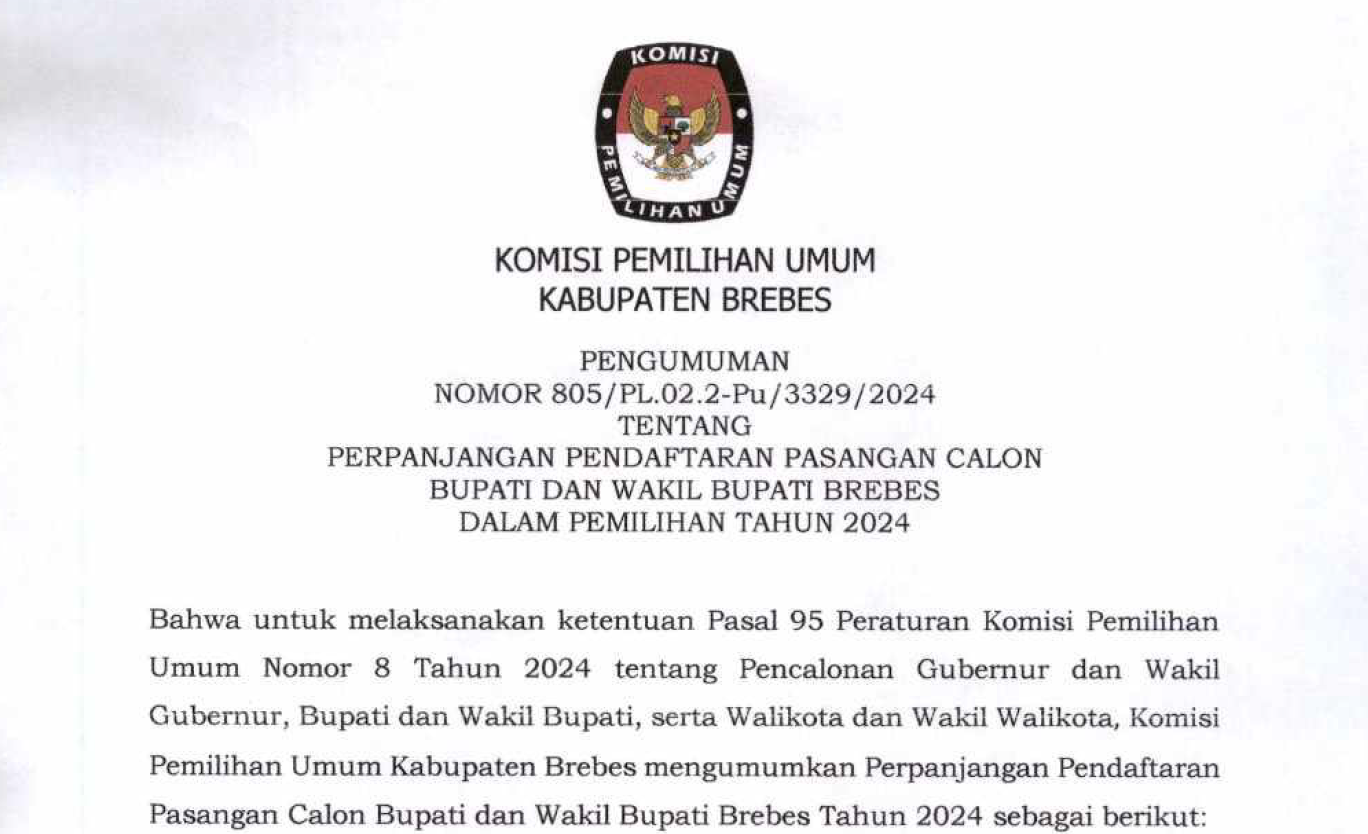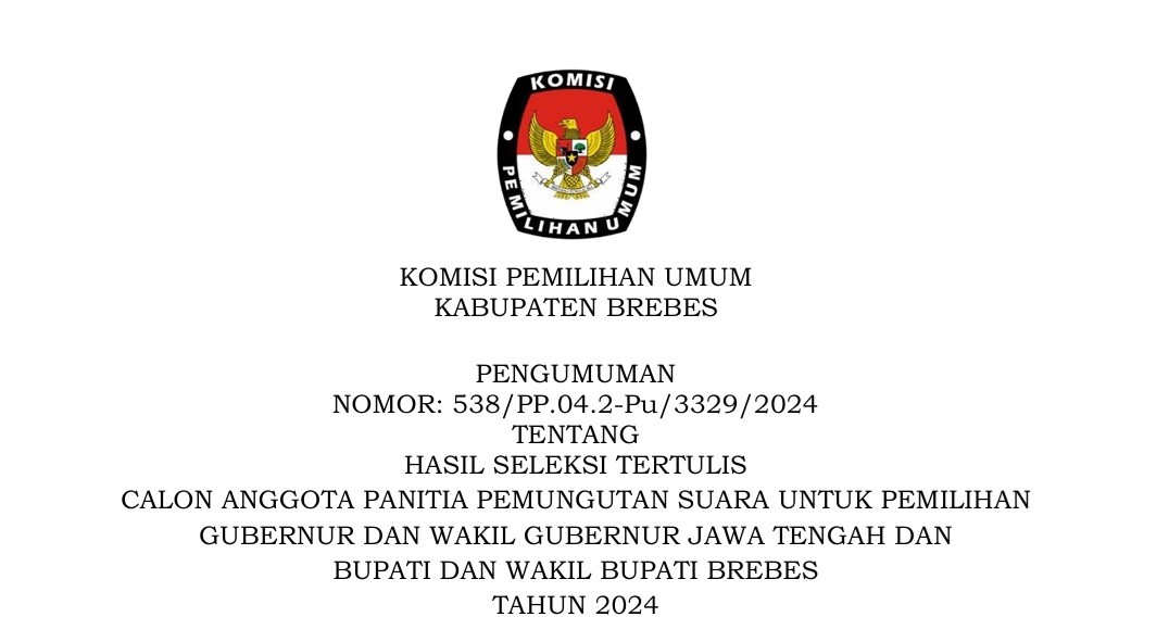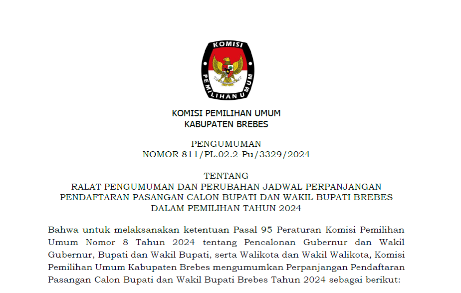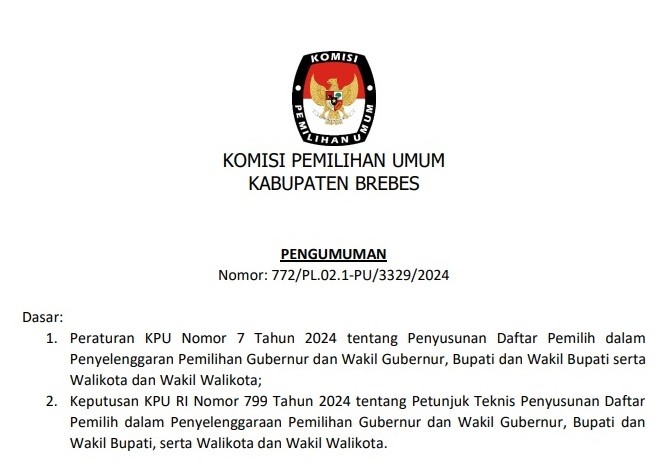 Dalam rangka pelaksanaan tahapan pemutakhiran data pemilih Pemilihan Gubernur dan Wakil Gubernur Jawa Tengah serta Bupati dan Wakil Bupati Brebes Tahun 2024 sesuai ketentuan sebagaimana tersebut di atas, serta dalam rangka mewujudkan daftar pemilih yang komprehensif, akurat dan mutakhir, bersama ini kami sampaikan kepada masyarakat di Kabupaten Brebes bahwa KPU Kabupaten Brebes melalui Panitia Pemungutan Suara (PPS) telah mengumumkan Daftar Pemilih Sementara (DPS) Pemilihan Gubernur dan Wakil Gubernur Jawa Tengah serta Bupati dan Wakil Bupati Brebes Tahun 2024 di Kantor Kelurahan/balai desa seKabupaten Brebes. Download Pengumuman disini