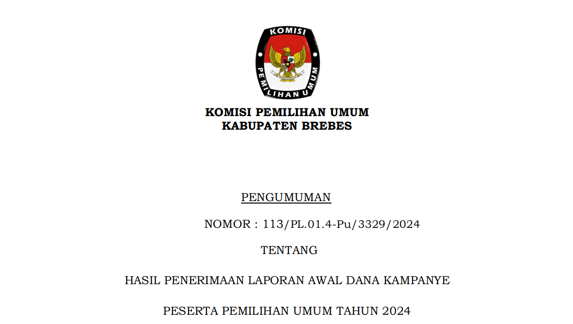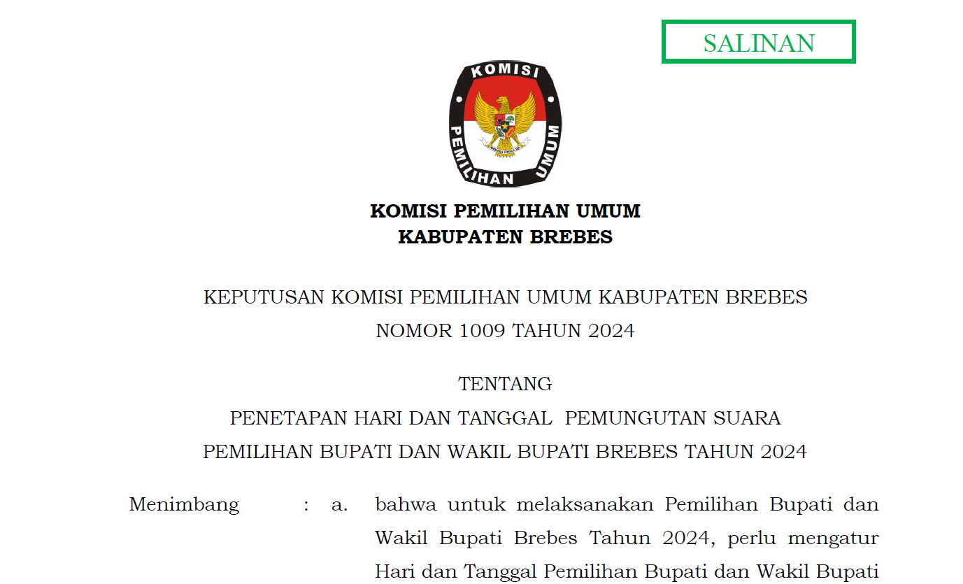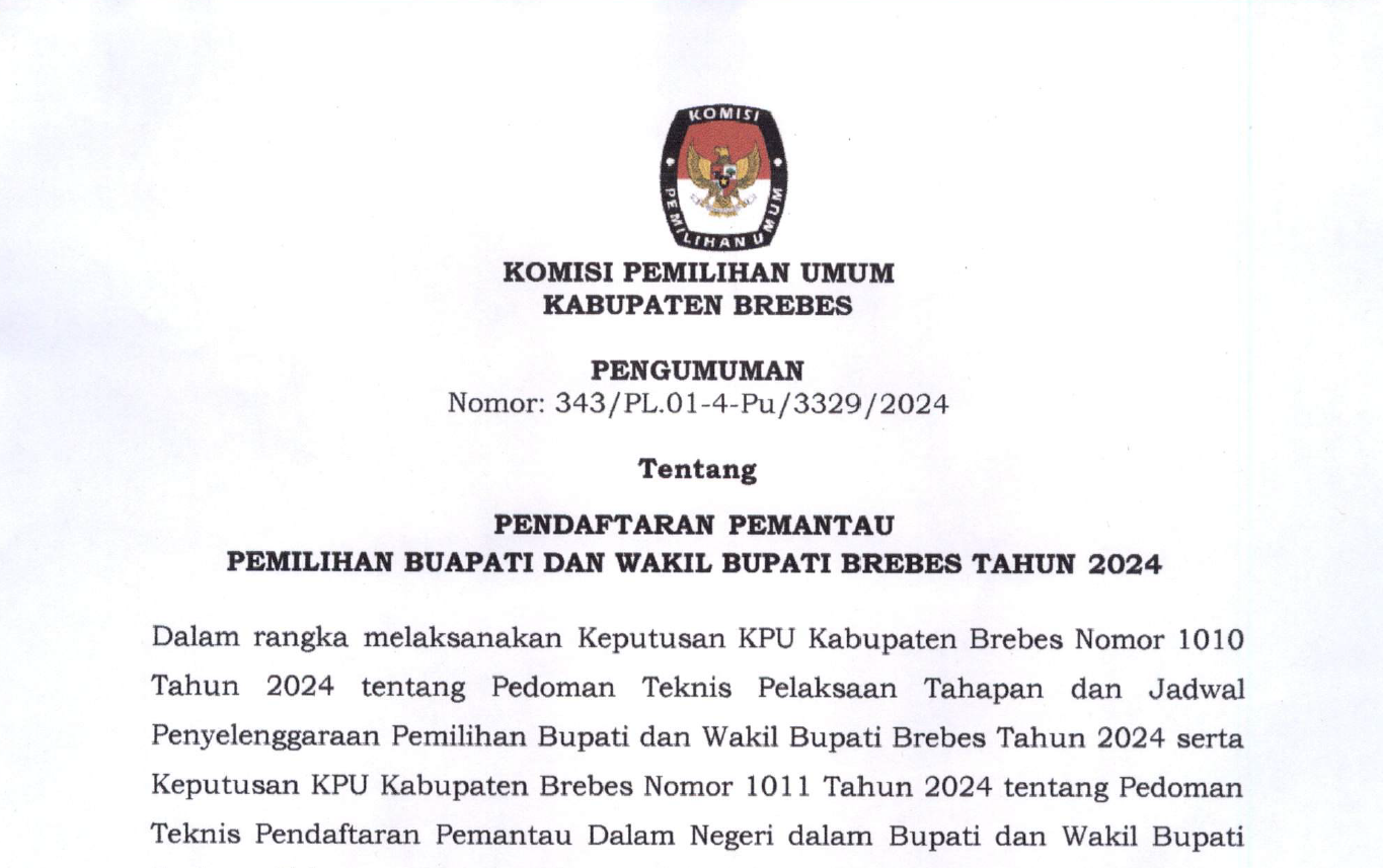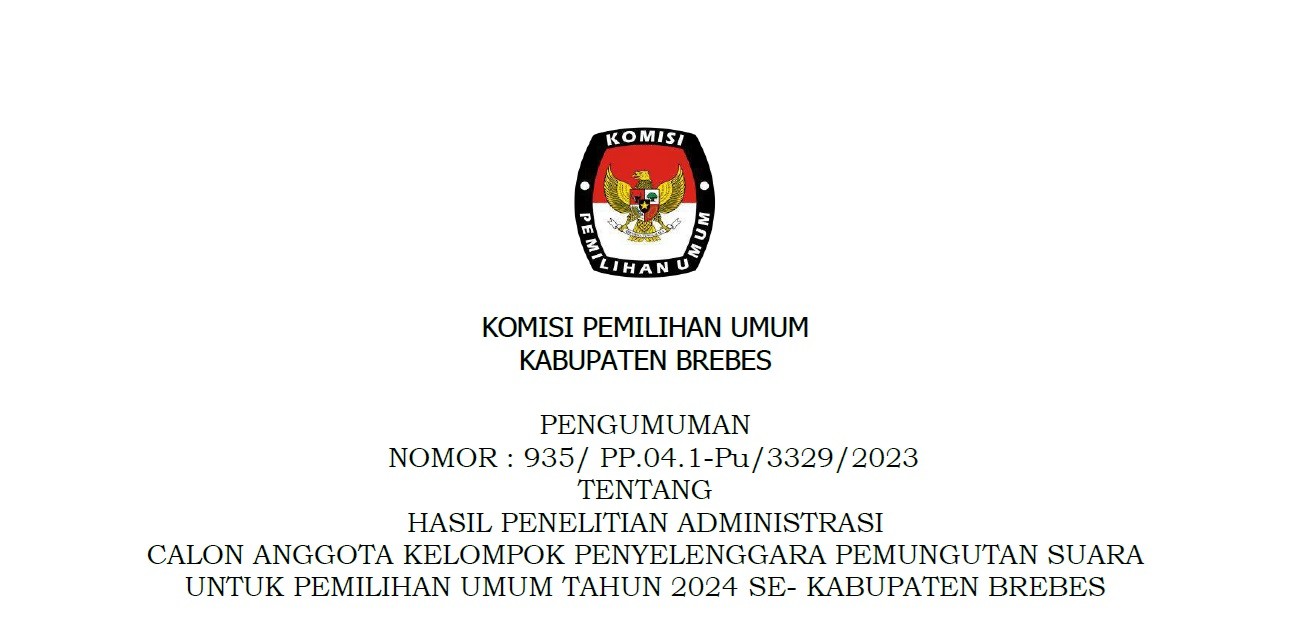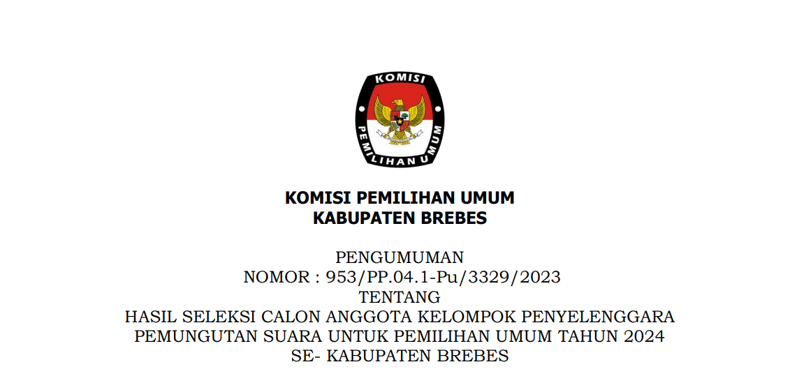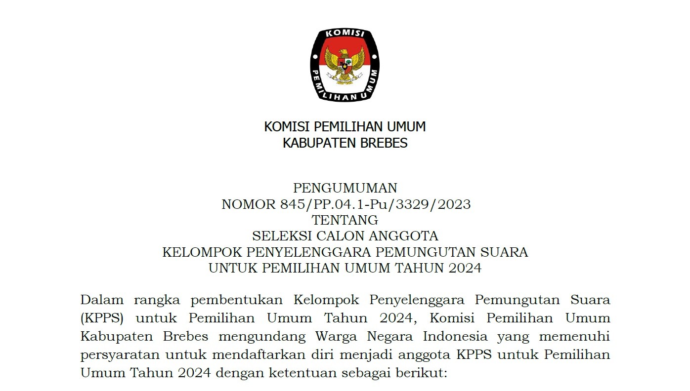 BREBES - Dalam rangka pembentukan Kelompok Penyelenggara Pemungutan Suara (KPPS) untuk Pemilihan Umum Tahun 2024, Komisi Pemilihan Umum Kabupaten Brebes mengundang Warga Negara Indonesia yang memenuhi persyaratan untuk mendaftarkan diri menjadi anggota KPPS untuk Pemilihan Umum Tahun 2024 dengan ketentuan sebagai berikut: UNDUH DISINI